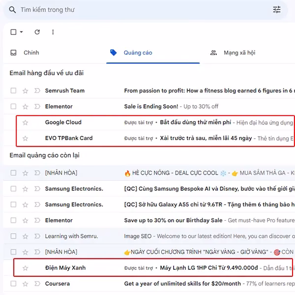 Quảng cáo Google Ads hiển thị trong tab Quảng cáo trên các Gmail cá nhân miễn phí.